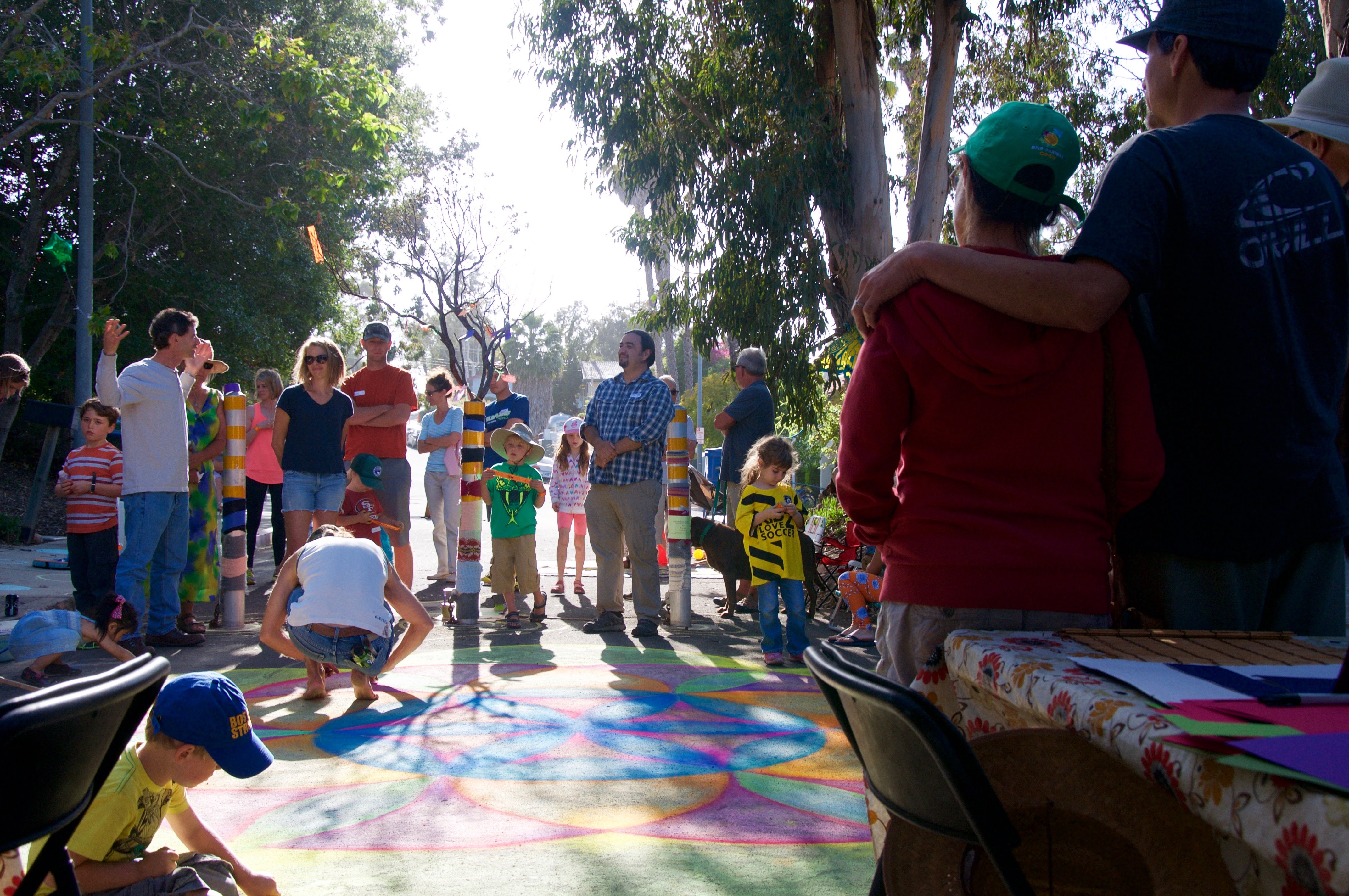 The city of SLO had wanted to open up a street that had been closed for over 20 years to help distribute traffic more evenly. The traffic models all suggested it was a good idea but the models didn’t take into account that the neighborhood had adapted and this area had become the public park and safe route to school for cyclist and students. The town was working on another program to develop safe routes to school but in reality it was already happening due to the ballasts that blocked through traffic. The community gathered at the “Posts” and painted street to show that this was a special place. It became a named place “The Posts”, the community started having meetings at the “Posts” and members of the city council came to our community place. After many discussions at the “Posts” the city council was able to understand the reality and beauty of this neighborhood place that had been created. This area did not have an open space or a city park so it was starting for places for people to gather. Eventually the community scheduled a spot at a city council meeting and they presented their case. The council and mayor were convinced and they commended the community for being a great example of how democracy should work. Placemaking is a core element of unity communities around a place.